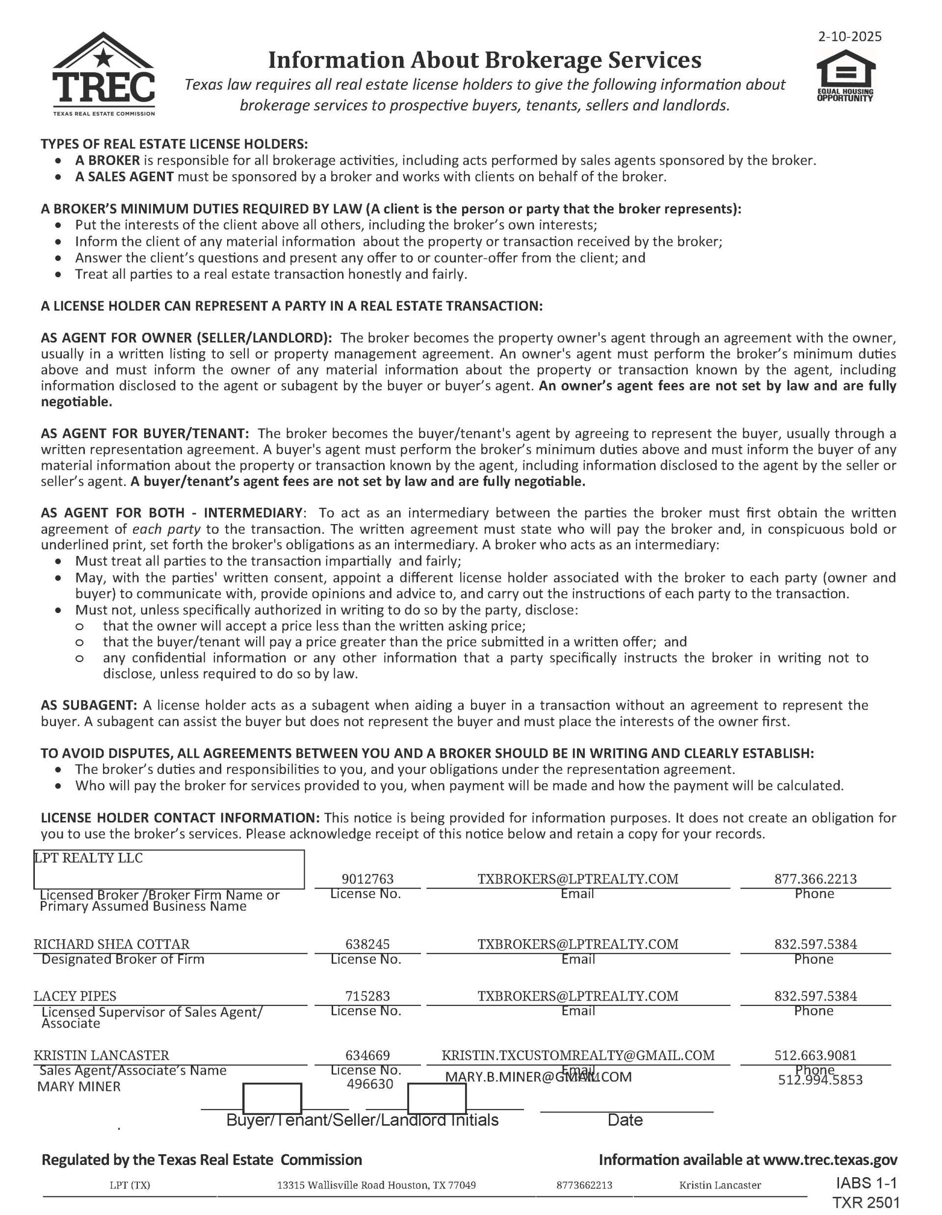 PLEASE READ: Texas law requires all real estate licensees provide the Texas Real Estate Commission Information About Brokerage Services to prospective buyers, tenants, sellers and landlords, plus TREC's Consumer Protection Notice.
